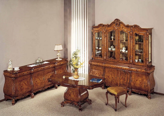 Set for the dining room 379 / 380 / 382 / 377 / 377/C / 377/S of the Italian producer of BTC. Set includes dining table, upholstered chairs, dresser and sideboard. The furniture is made of solid wood, veneer finish. Dining room decorated with inlay. Set in a classic style. Colors: natural wood color, brown.
