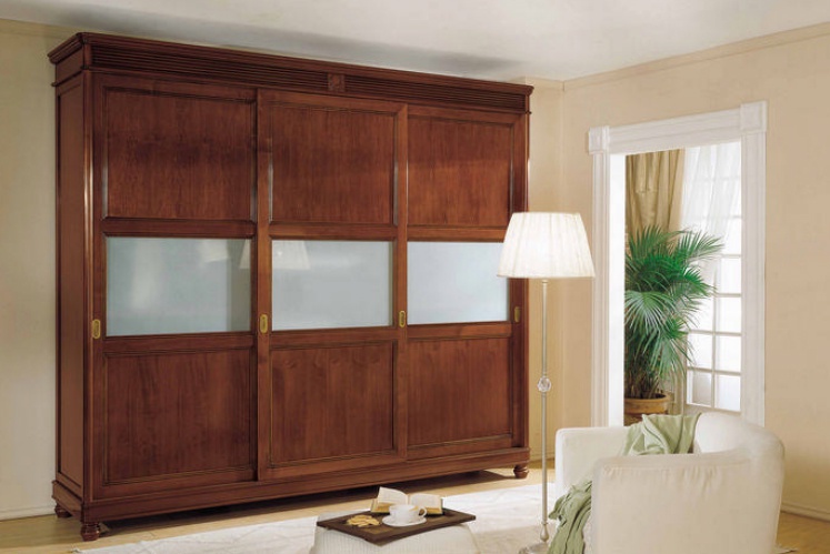 Wardrobe tricuspid 4116 from the Italian manufacturer BTC. The frame is made from solid wood, inset with glass. The doors are sliding. The model is intended for bedrooms in classic style. Colors: natural wood color, brown.