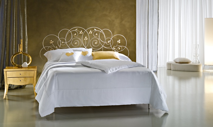 Double bed from Italian manufacturer Ciacci. Bed with high headboard made of metal. Color from the manufacturer Golden. The bed is designed in modern style.