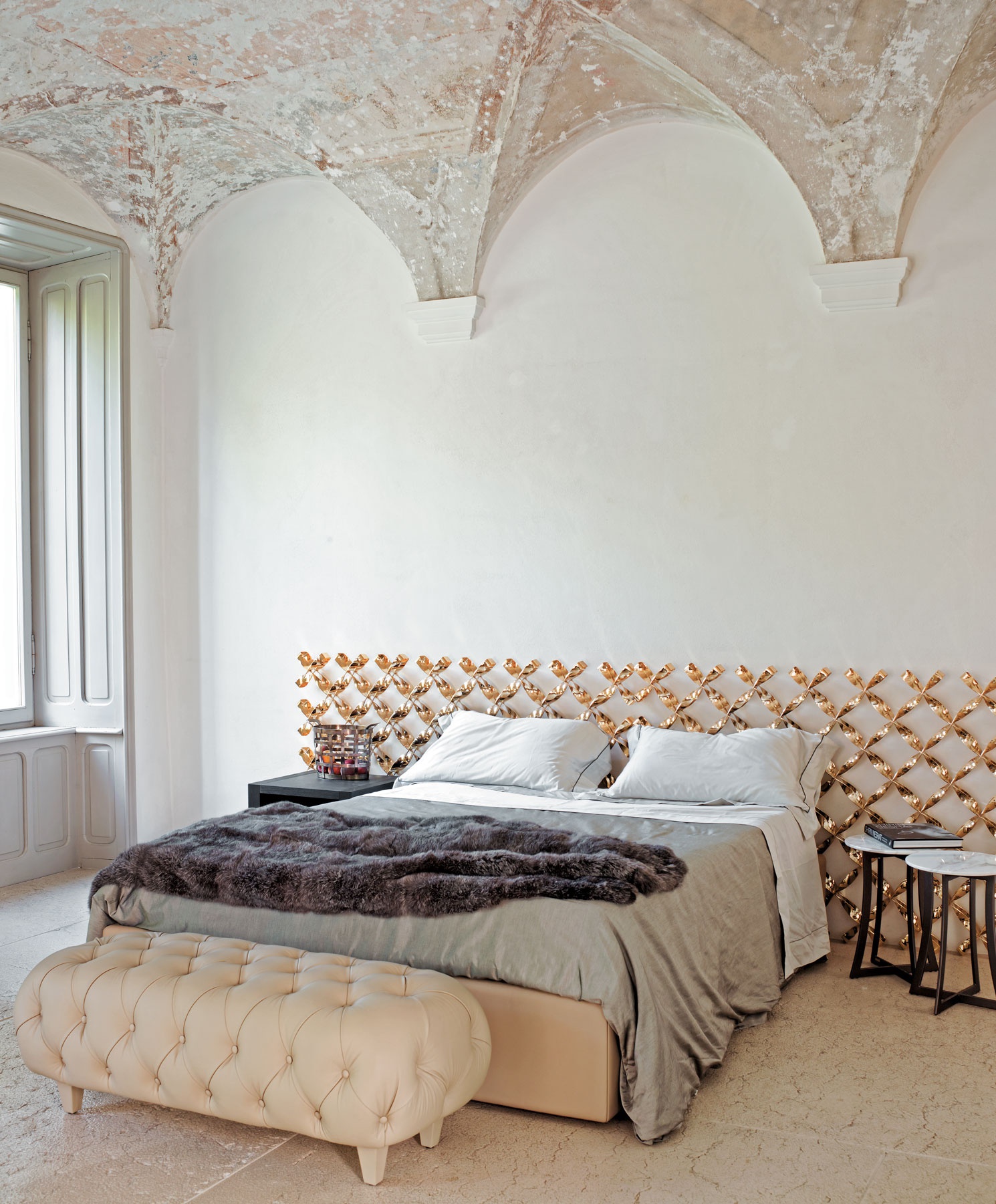 Double bed, from the Italian manufacturers Ciacci. Feature a double bed with high headboard in the form of a lattice. The frame is made of metal. Color from manufacturer copper. The bed is designed in modern style.