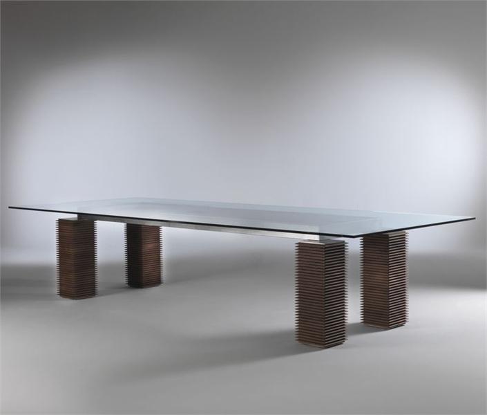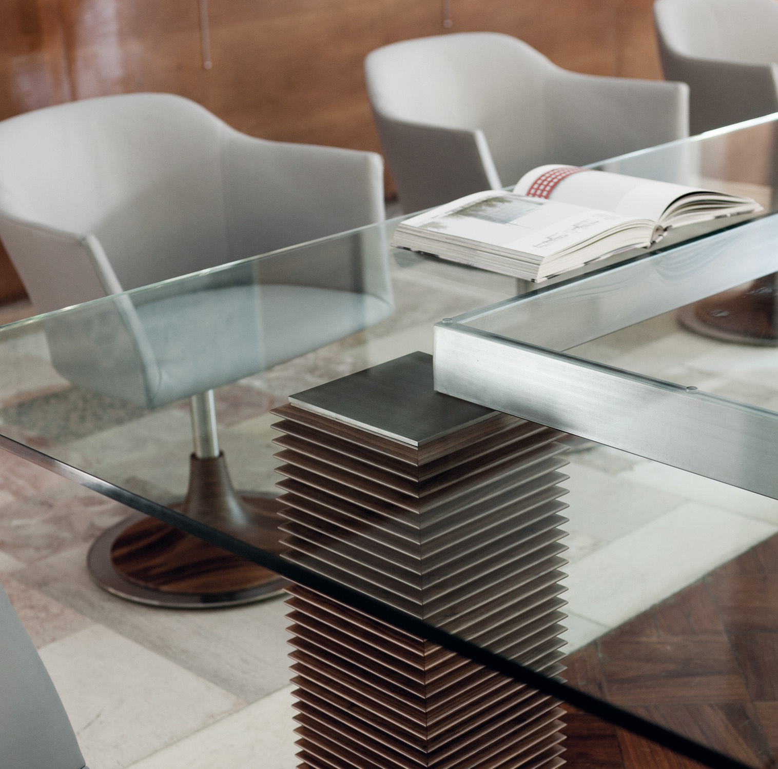 Burton dining table by Italian manufacturer Porada. Legs are made of solid wood. The surface is covered with Matt lacquer. Countertop rectangular from transparent glass. The individual elements are made of metal. Comfortable and modern model will be the decoration of your interior.