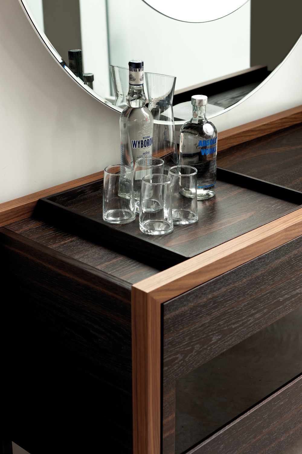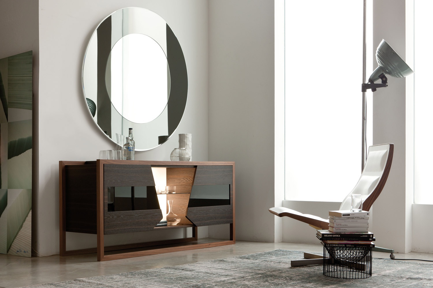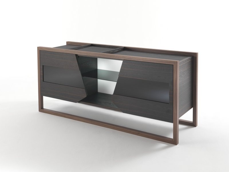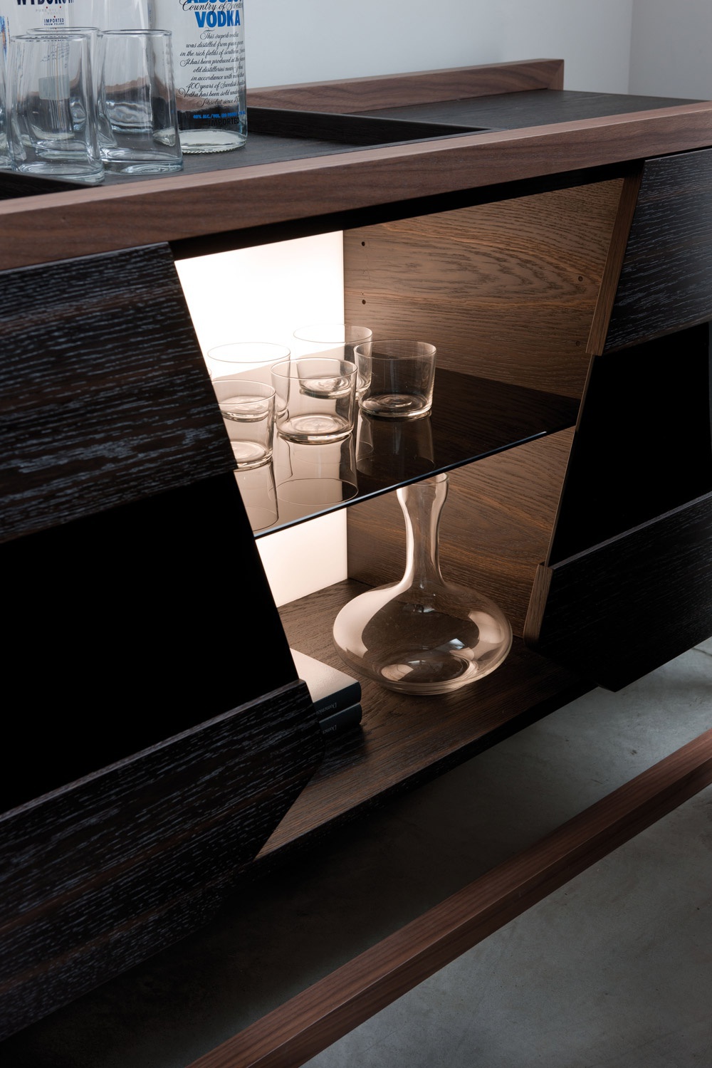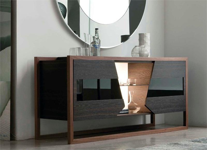 Commode - console Drink from the Italian manufacturer Porada. The frame and legs are made of solid wood. The surface is treated with lacquer from the collection of the company. Sash with decorative glass inserts. Inside are glass shelves. Additionally the model is equipped with a backlight.