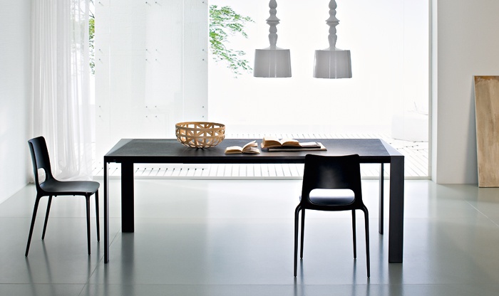 Set for the dining room from Italian manufacturer Ciacci. Consists of dining table and chairs. The frames are made of metal. The seats and backs of chairs made of plastic. Set is manufactured in contemporary style. Offered in black color variant.