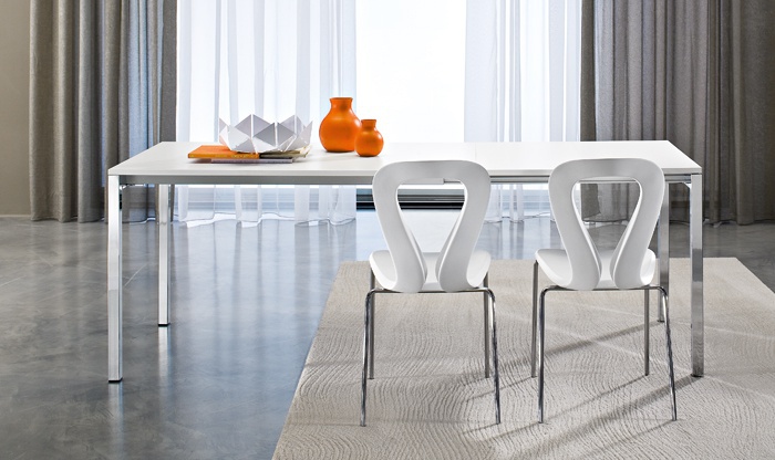 Set for the dining room from Italian manufacturer Ciacci. Consists of a rectangular dining table and chairs with decorative back. The frames are made of metal. Seat and back made of plastic. Color scheme in white. Set is manufactured in contemporary style.
