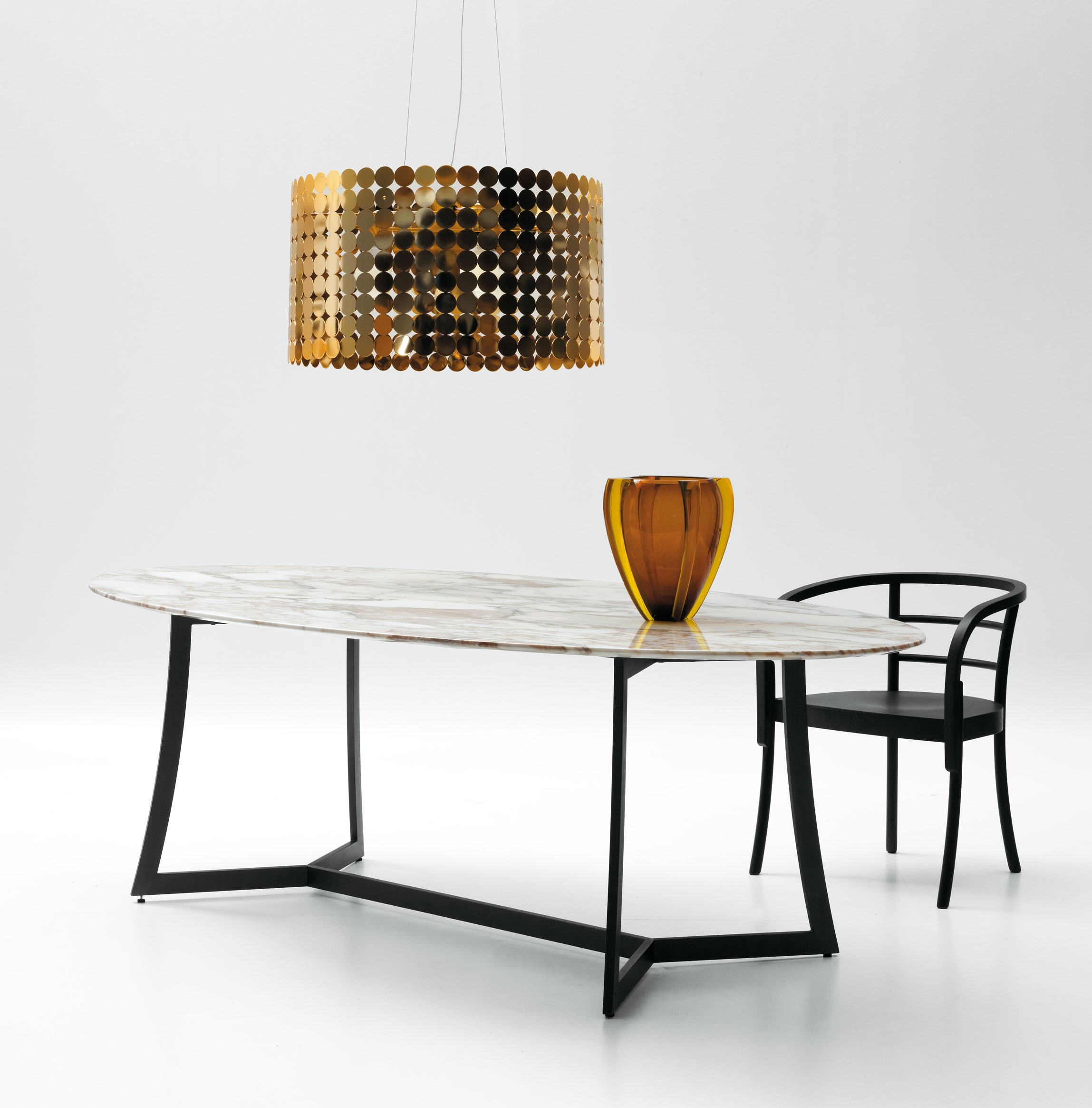 Set for the dining room from Italian manufacturer Ciacci. The presented model oval dining table and chairs with armrests. The frames are made of metal. Colors to choose from a range of companies.