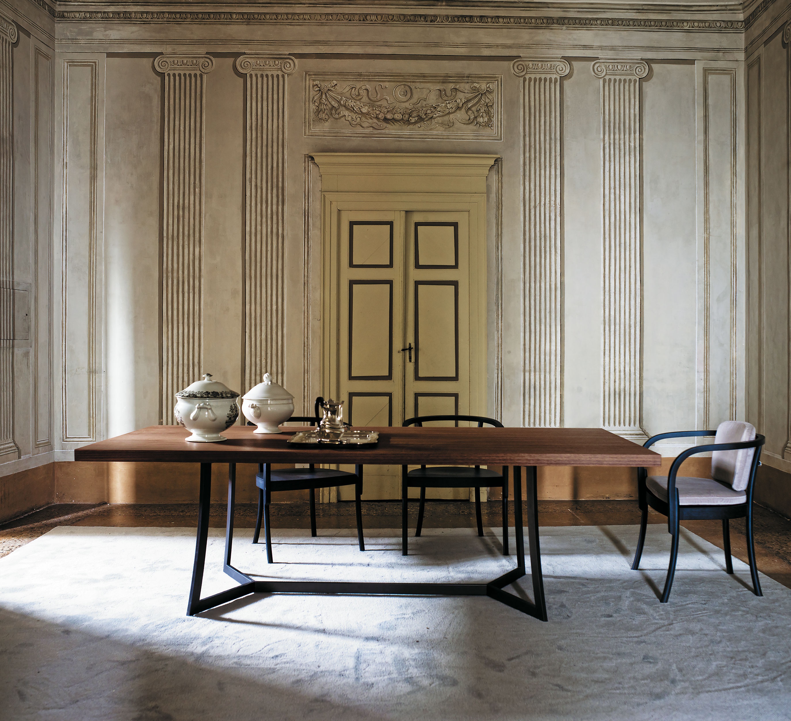 Set for the dining room from Italian manufacturer Ciacci. Consists of a rectangular dining table and chairs with armrests. The frames are made of metal. Colors to choose from a range of companies. Set is manufactured in contemporary style.