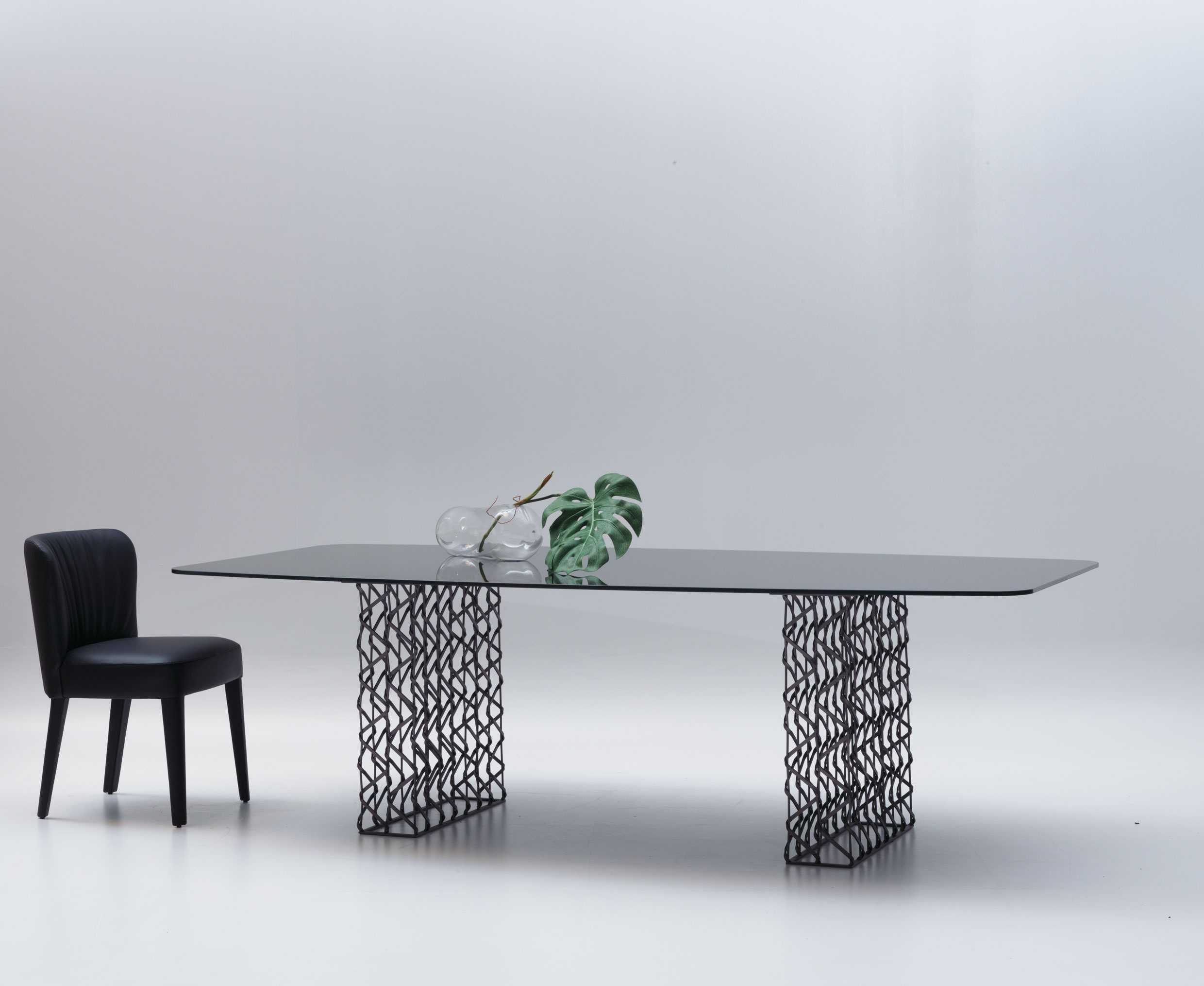 Set for the dining room from Italian manufacturer Ciacci. Presents set consists of dining table and chairs with soft seat and back. The frames are made of metal and glass. Color scheme from the manufacturer in black. Set is manufactured in contemporary style.
