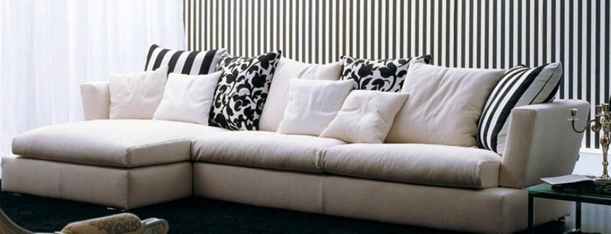 The Rodeo sofa from Italian manufacturer Bontempi Casa. The model is upholstered in fabric from the range campaign. The model will decorate the interior in a modern style. The design of complementary decorative pillows. Colors: white, gray, black.