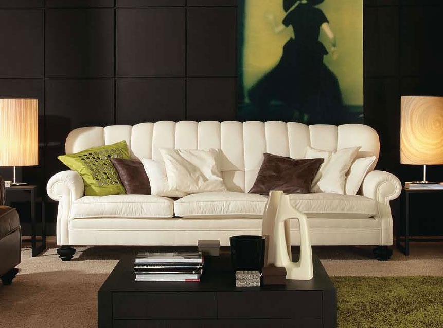 Jaquelin three seater sofa from Italian manufacturer Mobilidea. A sofa with a high back and soft armrests made in the art Deco style. The company offers two types of upholstery and fine fabrics or leather. Thanks to Royal forms and white colour of this model will make your interior a dreamy atmosphere.
