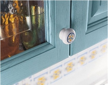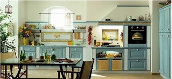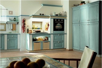 Set for the kitchen Ginestra from the Italian manufacturer Snaidero. The facade is made of solid chestnut wood, the surface is treated with varnish from the range of the campaign. Working surface made of ceramic tiles, natural stone, solid wood and particleboard. Set in a country style. Colors: natural color tree, white, blue.