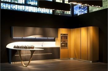Set for the kitchen Ola20 from the Italian manufacturer Snaidero. The curved facade doors made of fiberglass. All around the perimeter of the door is aluminum profile. The peculiarity of kitchen cabinets is the backbone of serving the working surface, made from solid wood. Kitchen with built-in illumination. Set in a contemporary style. Colors: natural wood color, brown.