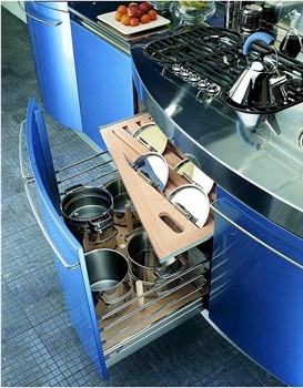 Set for the kitchen Ola from the Italian manufacturer Snaidero. The facades are covered in glossy or Matt lacquer from the range of the campaign. Work surface made of natural stone/solid wood or chipboard. Feature headset - rounded facades of some modules and wall Cabinet. Kitchen with built-in illumination. Set in a contemporary style. Color products blue.