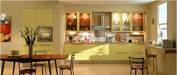 Set for the kitchen Opale from the Italian manufacturer Snaidero. Fronts lacquered from a range of campaigns. Work surface made of natural stone/solid wood or chipboard. The glass doors without handles. Kitchen with built-in illumination. Set in a contemporary style. Colours in stock.