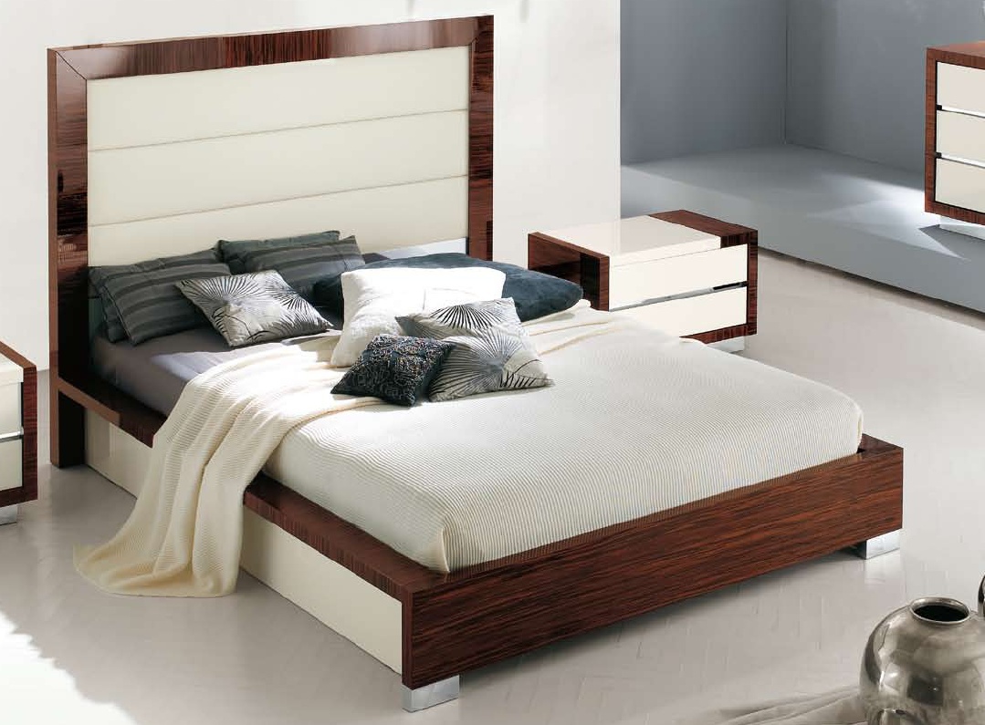 Double bed from Italian manufacturer Alf. Low legs in chromed metal. The frame is made from solid wood. Finish - lacquer or veneer. High headboard covered with white skin color with decorative stitches. The model is made in a modern style.