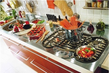 Set for the kitchen Sintesi from the Italian manufacturer Snaidero. Fronts lacquered from a range of campaign or tinted walnut. Work surface made of natural stone/solid wood or chipboard. The doors - frosted glass. Kitchen with built-in illumination. Set in a contemporary style. Colors: natural wood color, brown, steel.