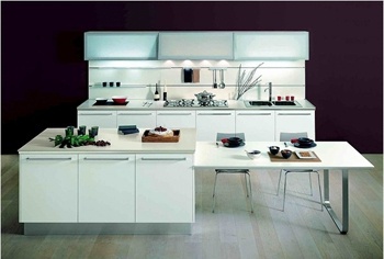 Set for the kitchen Sintesi from the Italian manufacturer Snaidero. Fronts lacquered from a range of campaign or tinted walnut. Work surface made of natural stone/solid wood or chipboard. Kitchen with built-in illumination. Set in a contemporary style. Colors: white, steel.