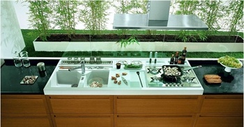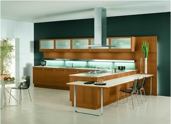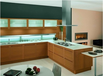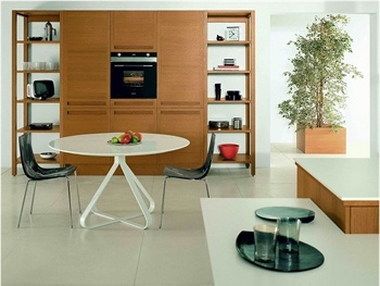 Set for the kitchen Terra from the Italian manufacturer Snaidero. The facades are made of tinted oak wood. Work surface made of natural stone/solid wood or laminate. Doors - glass. Kitchen with built-in illumination. Set in a contemporary style. Colors: natural wood color, white, brown.