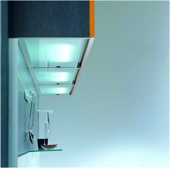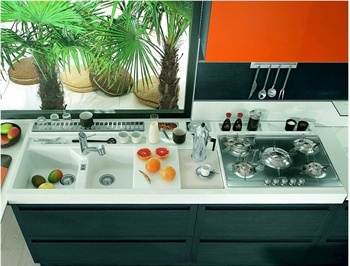 Set for the kitchen Terra from the Italian manufacturer Snaidero. The facades are made of tinted oak wood. Work surface made of natural stone/solid wood or laminate. Doors - glass. Kitchen with built-in illumination. Set in a contemporary style. Colors: white, orange, black.
