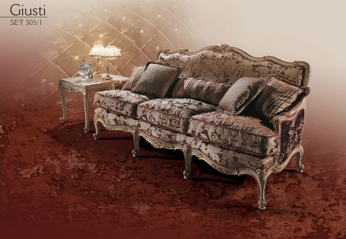 Three seater sofa Giusti from the Italian manufacturer Angelo Cappellini. Frame and shaped legs made from solid wood. The surface is covered with varnish. Upholstery textile from the collection company. The seat cushion is removable. The filler is polyurethane foam and goose feather. Decoration is the decorative carving handmade.