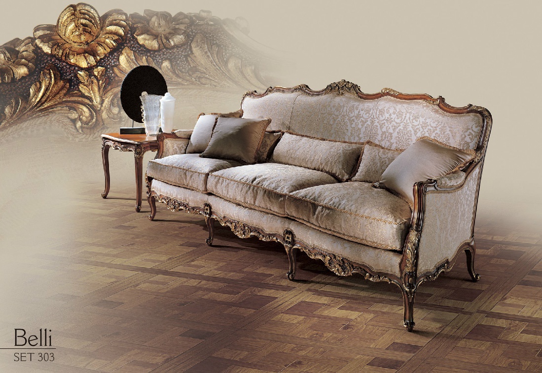 Three seater sofa Belli from Italian manufacturer Angelo Cappellini. The frame and legs are made of solid wood. The surface is covered with a glossy varnish. Upholstery textile from the collection company. Filler - polyurethane foam of different firmness. Decoration is the decorative carving handmade. In addition offered are decorative pillows of different sizes.