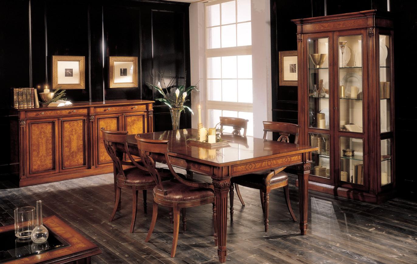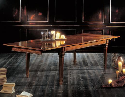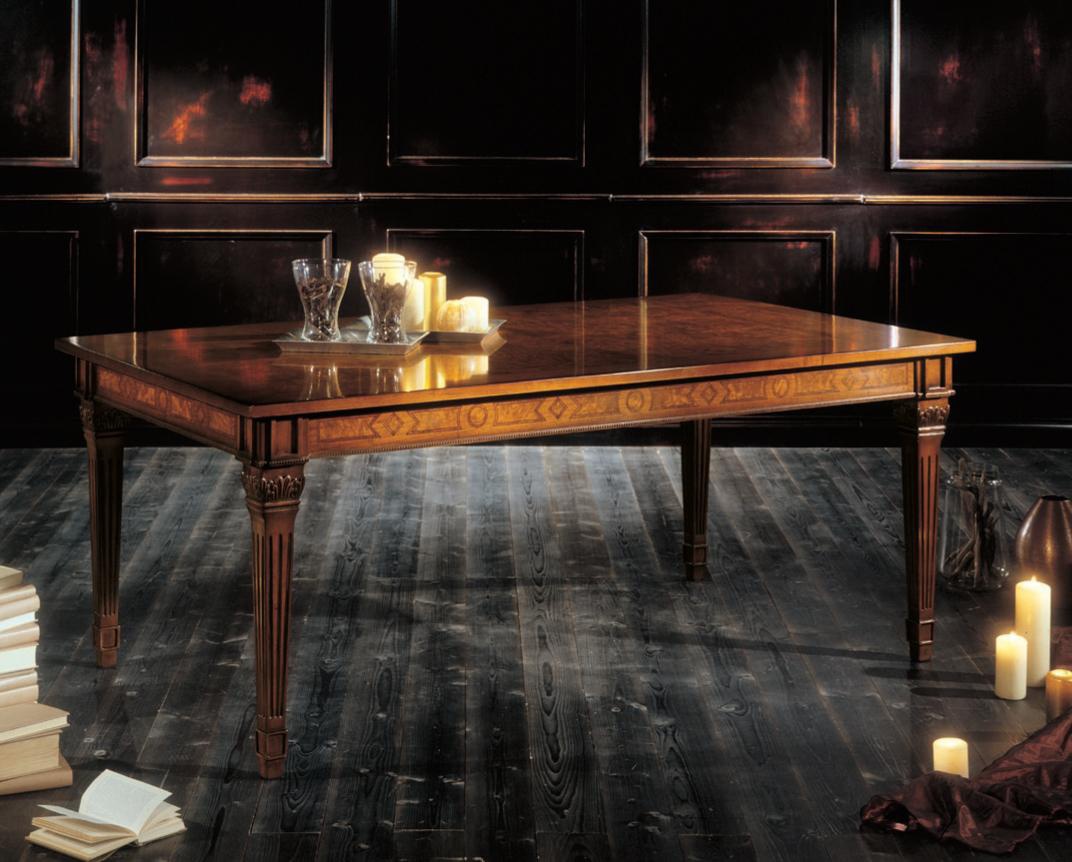 Dining table in classical style from the Italian manufacturer Bianchini. The product is made from solid wood. Table of rectangular form on four carved legs, six seats and extendible for a further two. The surface is treated with a special formula preserves the natural color of wood and prevents from damage.