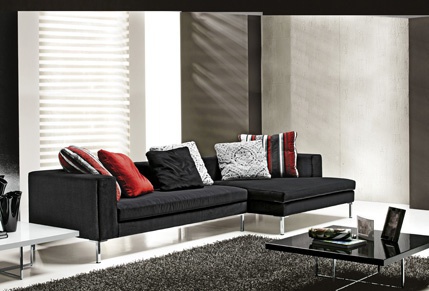 Sofa Delon, from the Italian manufacturer Formerin. The frame is made of wood. Upholstery - textiles from the company portfolio. Legs - metal. Colors - black.