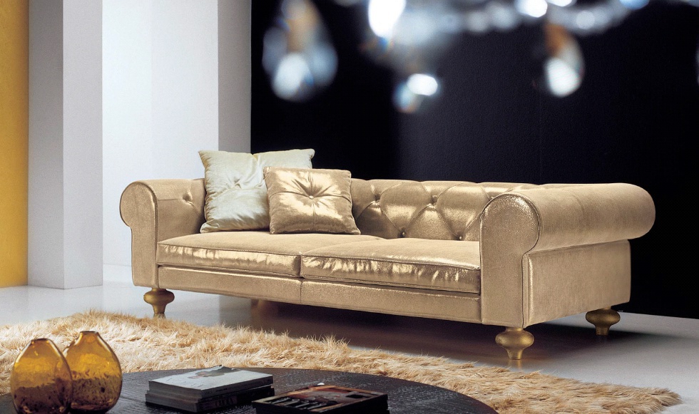 The Joyce sofa from Italian manufacturer Formerin. The frame is made of wood. Wooden legs, lacquered. Possible finishes: gold or black lacquer. Upholstered in textile or leather from the company portfolio. Colours in stock. The back is decorated with stitch - Capito.