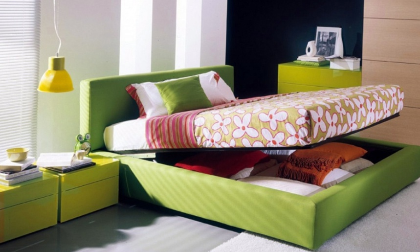 The Yasmin bed from Italian manufacturer Bontempi Casa. The model is upholstered in fabric from the range campaign. Double bed, on the podium with drawer for storage. A wonderful choice for the bedroom in modern style. Product color green.