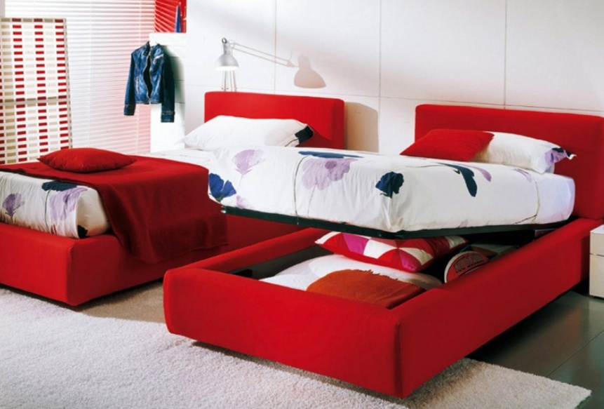 The Yasmin single bed by Italian manufacturer Bontempi Casa. The model is upholstered in fabric from the range campaign. Bed with high headboard and soft. And with storage box. A charming choice for the bedroom in modern style. Product color red.