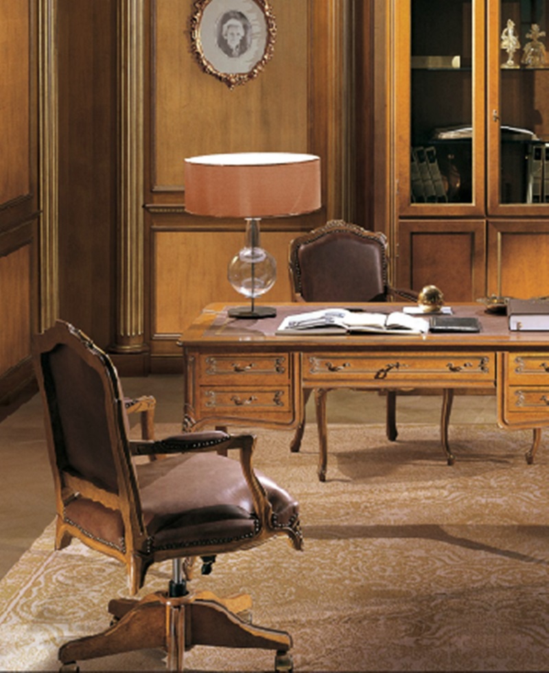 Working the Bernini chair from the Italian manufacturer Angelo Cappellini. Made in the classic style. The frame is made from solid wood. Finish option to choose from a collection company. Legs are complemented by the wheels. Upholstery textile or leather. The model is decorated with carvings and furniture nails.