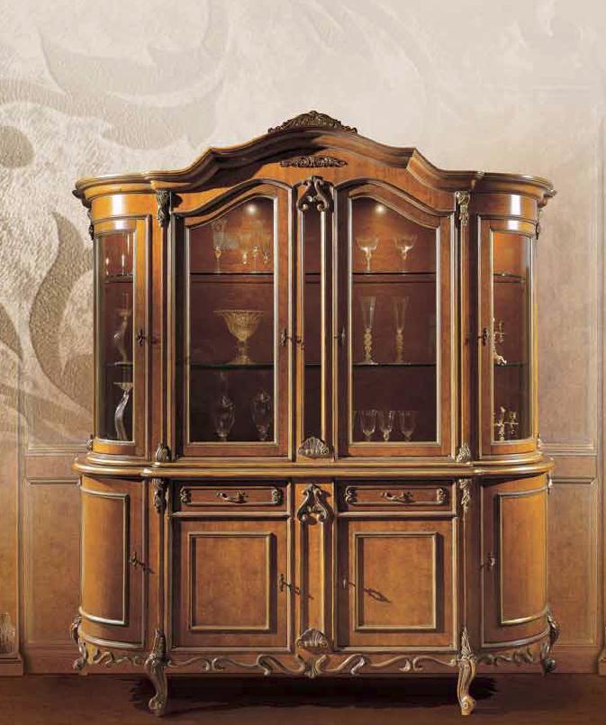 Showcase Cignani from the Italian manufacturer Angelo Cappellini. Model with hinged doors and two drawers. Body and legs made of solid wood. The door is glazed top and bottom completely deaf. Accessories metal. Decoration is the decorative carving handmade.