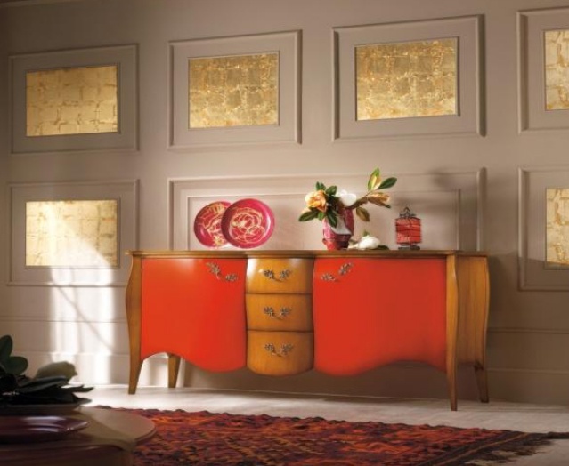 Cabinet 709/G from the Italian manufacturer BTC. The frame is made from solid wood, the surface is treated with varnish from the range of the campaign. Model with three drawers and two swing doors. A great choice for interior design in eclectic style. Colours in stock.
