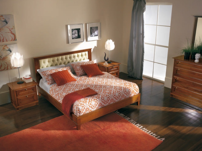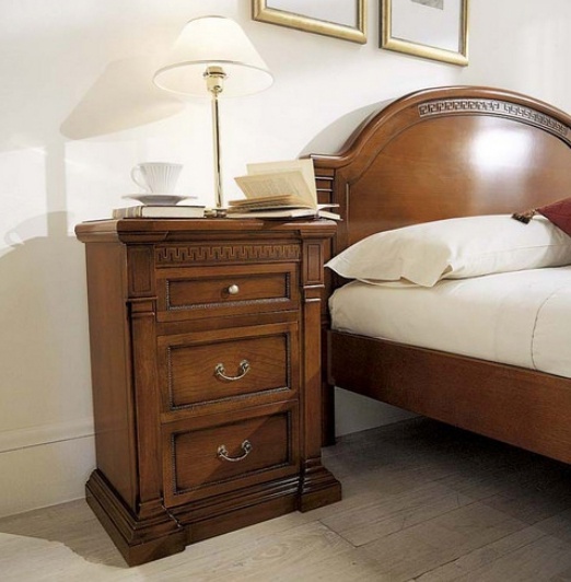 Headsets for bedrooms from Italian manufacturer BTC. Set includes double bed with footboard, two bedside tables and a chest of drawers. The furniture is made of solid wood, veneer finish. Bedroom in classical style. Colors: natural wood color, brown.