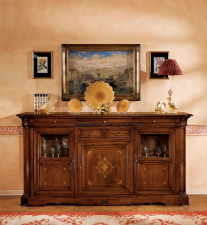 The buffet tricuspid E600 from the Italian manufacturer BTC. The frame is made from solid wood, veneer finish. Sash - blind/glass. The model is decorated with inlay. A chic choice for interior in classic style. Colors: natural wood color, brown.