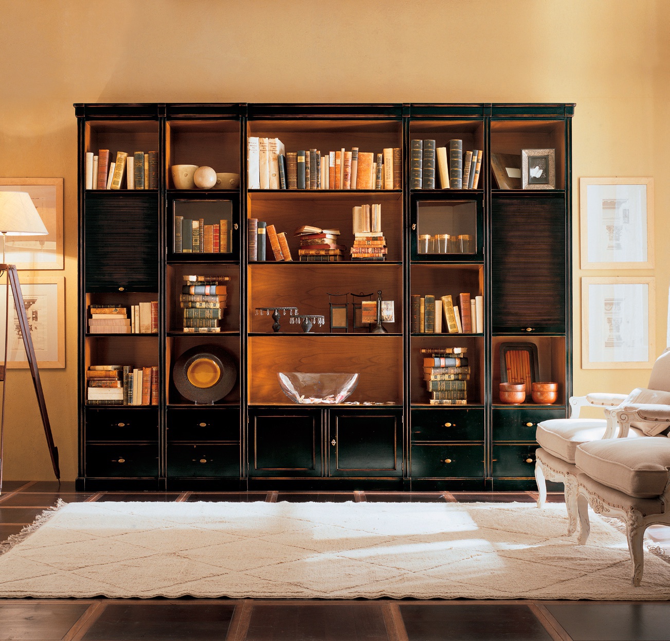 Wardrobe from the Italian manufacturer Bizzotto. Model on a frame of wood, with swinging doors, drawers and shutters-blinds. The design is executed in classical style. Finish in black tone with aging effect or to choose from a catalog company. The perfect solution for your interior office or library.