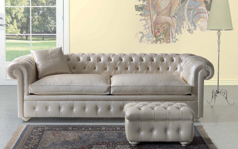 Double Chesterfield sofa from Italian manufacturer Asnaghi (Made in Italy). The wooden frame is completely hidden. Low legs are made of solid wood. Upholstery textile or leather. The cushion filling is foam. The backrest and armrests are decorated with stitch-Capito. In addition, it is proposed Ottoman leg similar design.