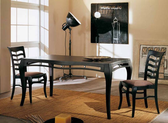 Dining table from Bakokko Italian manufacturer. Legs are high. The table top is rectangular. Material - solid wood. The varnish finish offered in black. The model is made in the style of art Deco. In addition offered chairs of similar design.