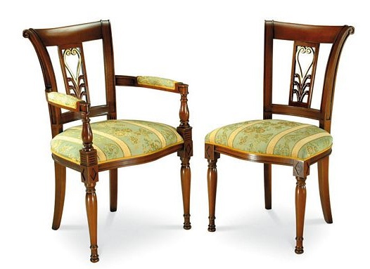 A chair from the Italian manufacturer Bakokko. There are two versions with or without armrests. The frame is made from solid wood. The surface is covered with a glossy varnish. The seat is covered with textile. Colors to choose from a collection company. Backrest and legs with decorative carving handmade.