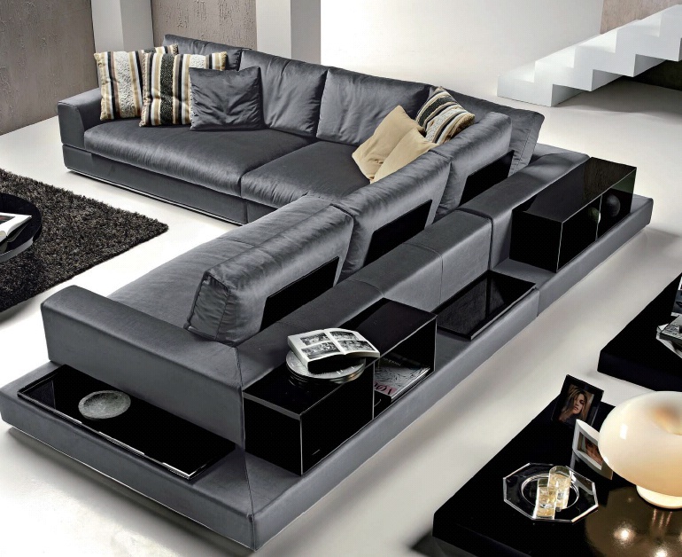Corner sofa My Way from the Italian manufacturer Formerin. The frame is made from solid wood. Upholstered in leather from the company portfolio. The legs are made of metal. Colors - black. The model is supplemented with comfortable shelves. The sofa is designed in modern style.