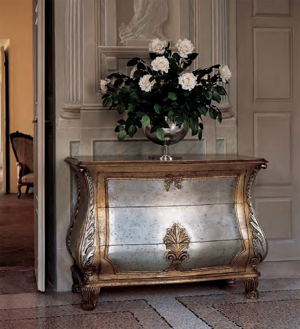 A chest of drawers from Italian manufacturer Bakokko. Model on low legs. The frame is made from solid wood. The surface is treated with glossy varnish from the company portfolio. Decoration is the decorative carving handmade.