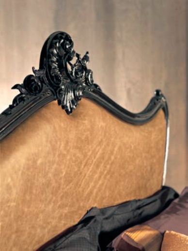 Bed 474 Lauren from the Italian manufacturer Bizzotto. Presents a model of the bed on figured legs and low footboard. The frame is made from solid wood and decorated with hand-carved headboard upholstered in fabric or beige colors to choose from manufacturer's catalogue. The classic solution for a modern bedroom interior.