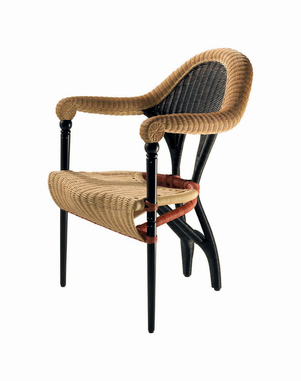 Liba chair from the Italian manufacturer Driade. The backrest, armrests and seat are made of rattan. Hind legs bent, front - decorated with carvings. The model is made in a combination of natural, black and red colours. Design solution for your interior.