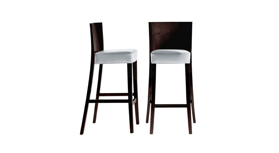 High bar stool Neoz produced by the Italian factory Driade. Frame and backrest made of solid mahogany. The back is hard. The soft seat is upholstered with white leather or fabric, colors to be selected from the company directory. Filling - polyurethane foam. The model is made in modern style. A great addition for the bar or kitchen.