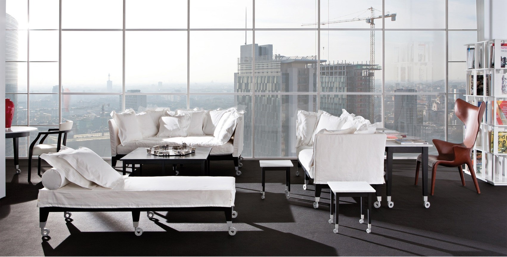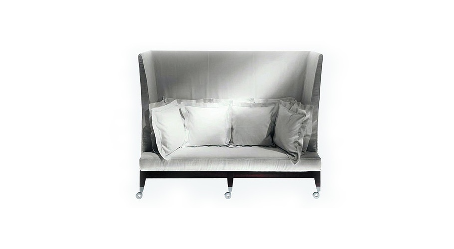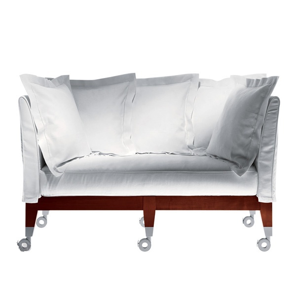 Semicircular Neoz sofa from Italian manufacturer Driade. The frame is made from solid mahogany. The legs on aluminum wheels. Sofa soft filler - polyurethane foam. Upholstery textile. Cover removable, white. The variant three-seater sofa. The design is accompanied by five pillows. The model is made in modern style.