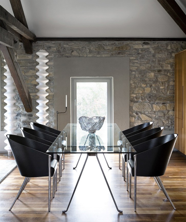 The Frate table by Italian manufacturer Driade. Steel legs, black color, connected with beech insert. Top of tempered glass, thickness 12 mm. the Factory offers different sizes of table. The model is made in modern style.