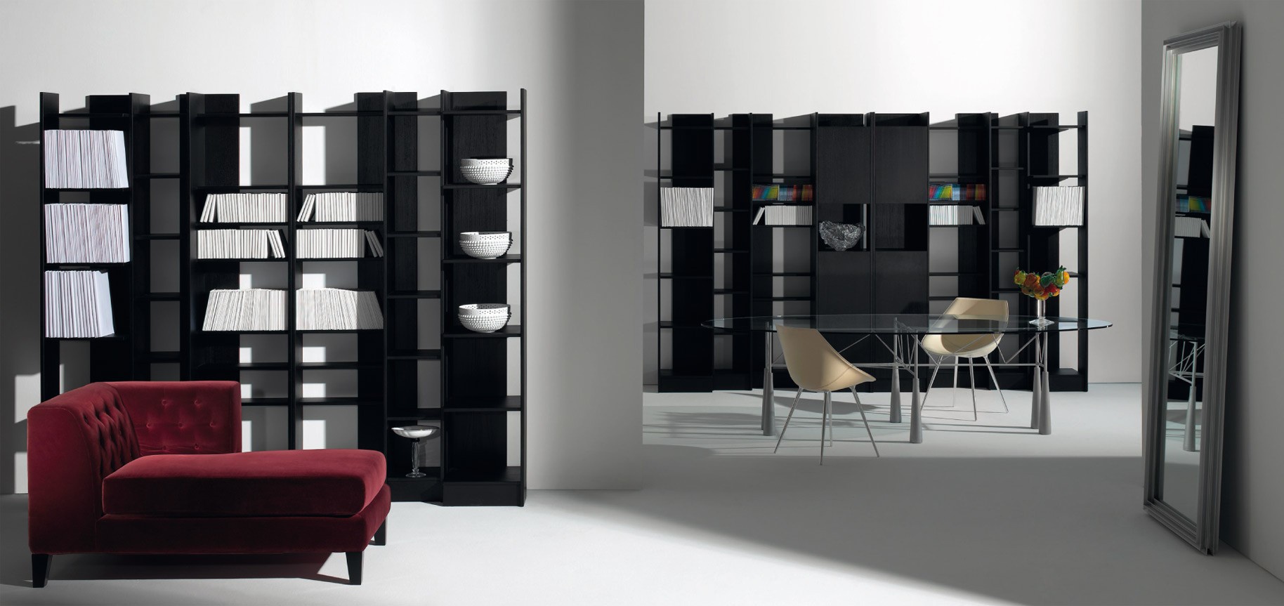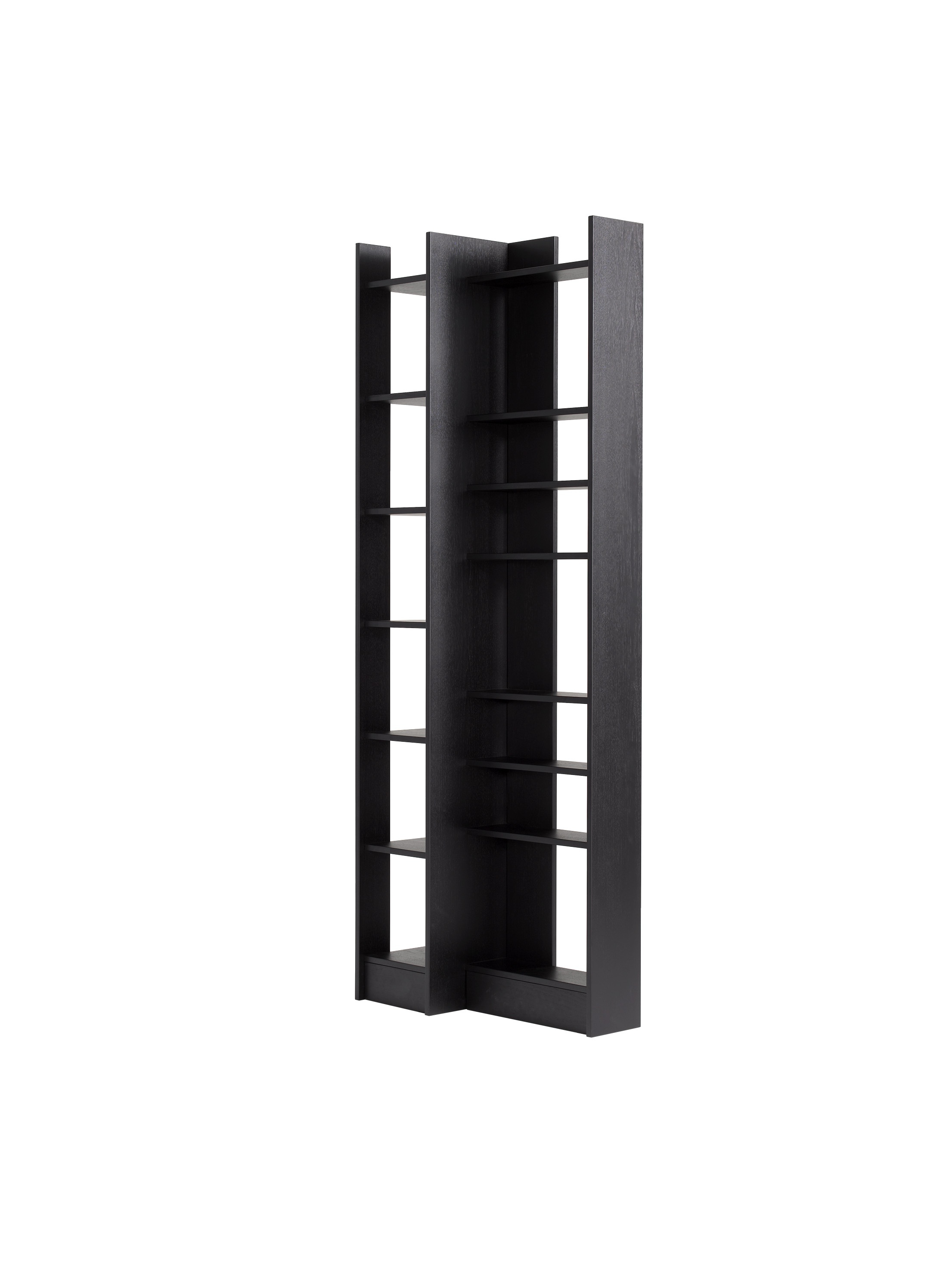 Rack Clay in a contemporary style from the Italian manufacturer Driade. The frame is made from solid bog oak. The model consists of two branches: one branch with seven shelves, the second with six deep shelves. The rack can be combined with modules Eileen, Colbert, Connor. A modern solution for living room, study or library.
