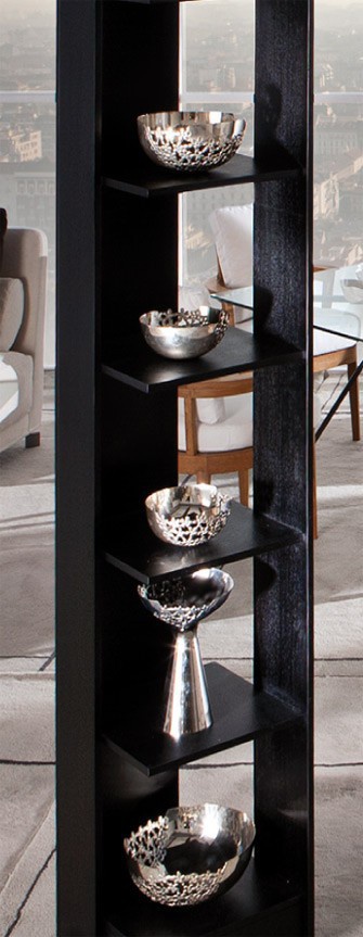 Tall, narrow bookcase Colbert from the Italian manufacturer Driade. The frame is made from solid bog oak. The model with five open bays. The rack can be combined with modules Eileen, Clay, Connor. A modern solution for living room, study or library.