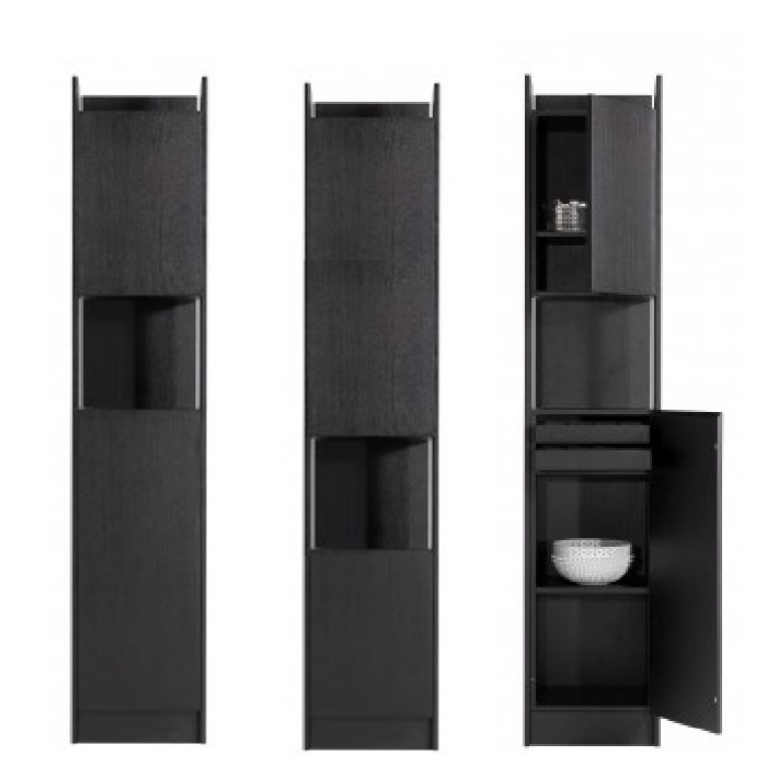 Narrow Cabinet'connor from the Italian manufacturer Driade. The frame is made from solid bog oak. Model with double doors and an open niche. The Cabinet can be combined with open shelving Eileen, Clay. A modern solution for living room, study or library.