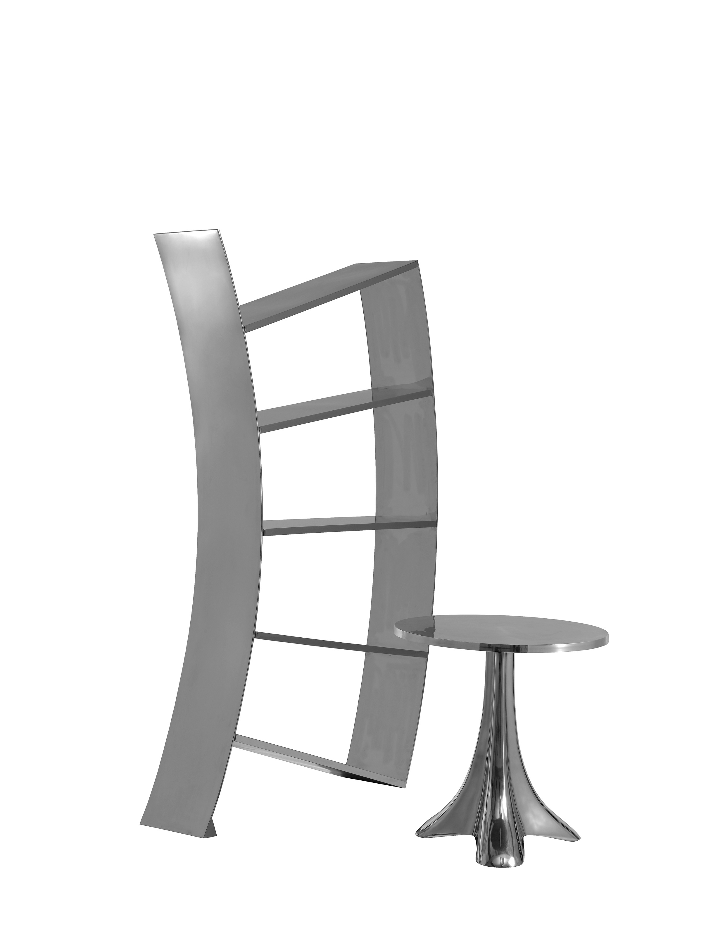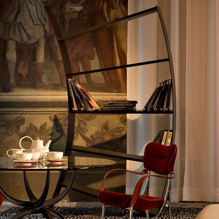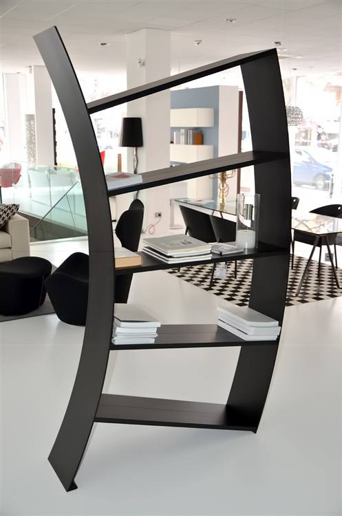Bookshelf Virgo production Driade. Frame and shelves made of black anodized aluminum. The rack is original, curved shape, can be set as near the wall and in the center of the room. Design solution for living room, study or home library in a modern style.