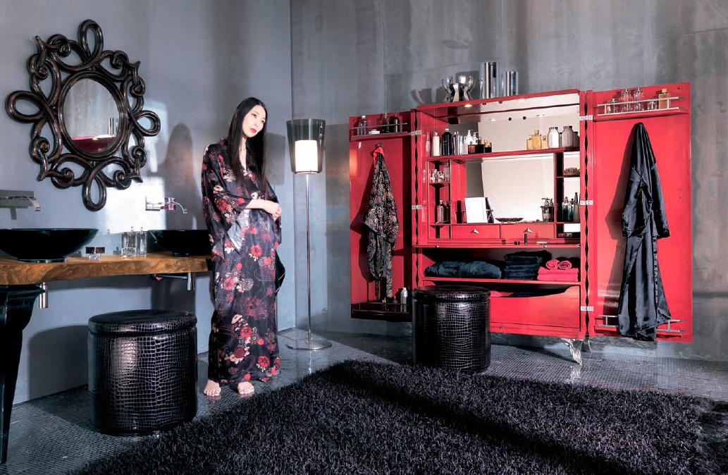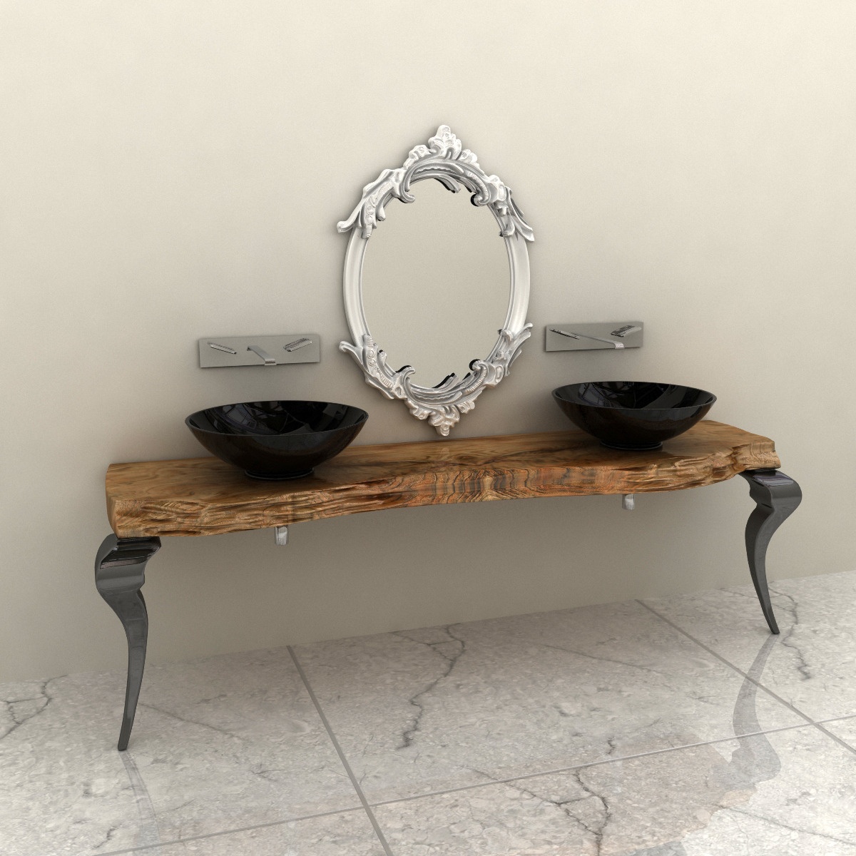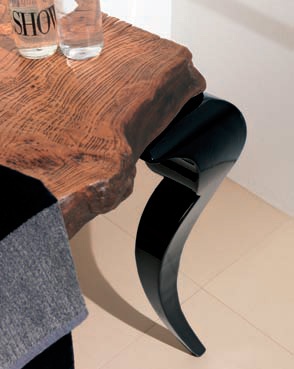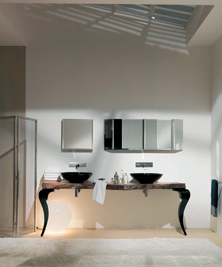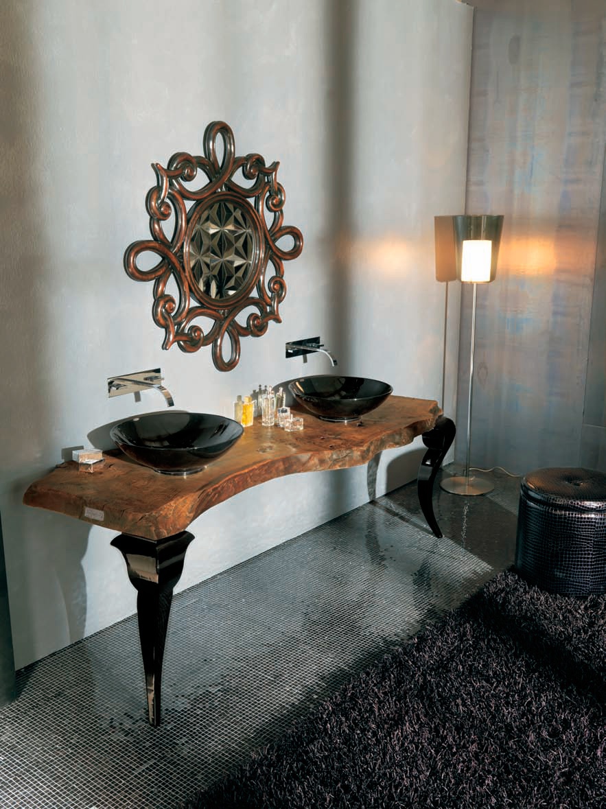 Console bath Sidney from the Italian manufacturer Bizzotto. Table top made from basal wood (radiaca), 200 year old trees. This tree is unique as it occurs in specific environmental conditions, such as floods, landslides, and therefore each product from the "radica" by their unique sizes and shapes. The legs are made of wood, figure, covered with black varnish. Equipped with two round sinks black. Designer and unique solution for modern bathroom interior.